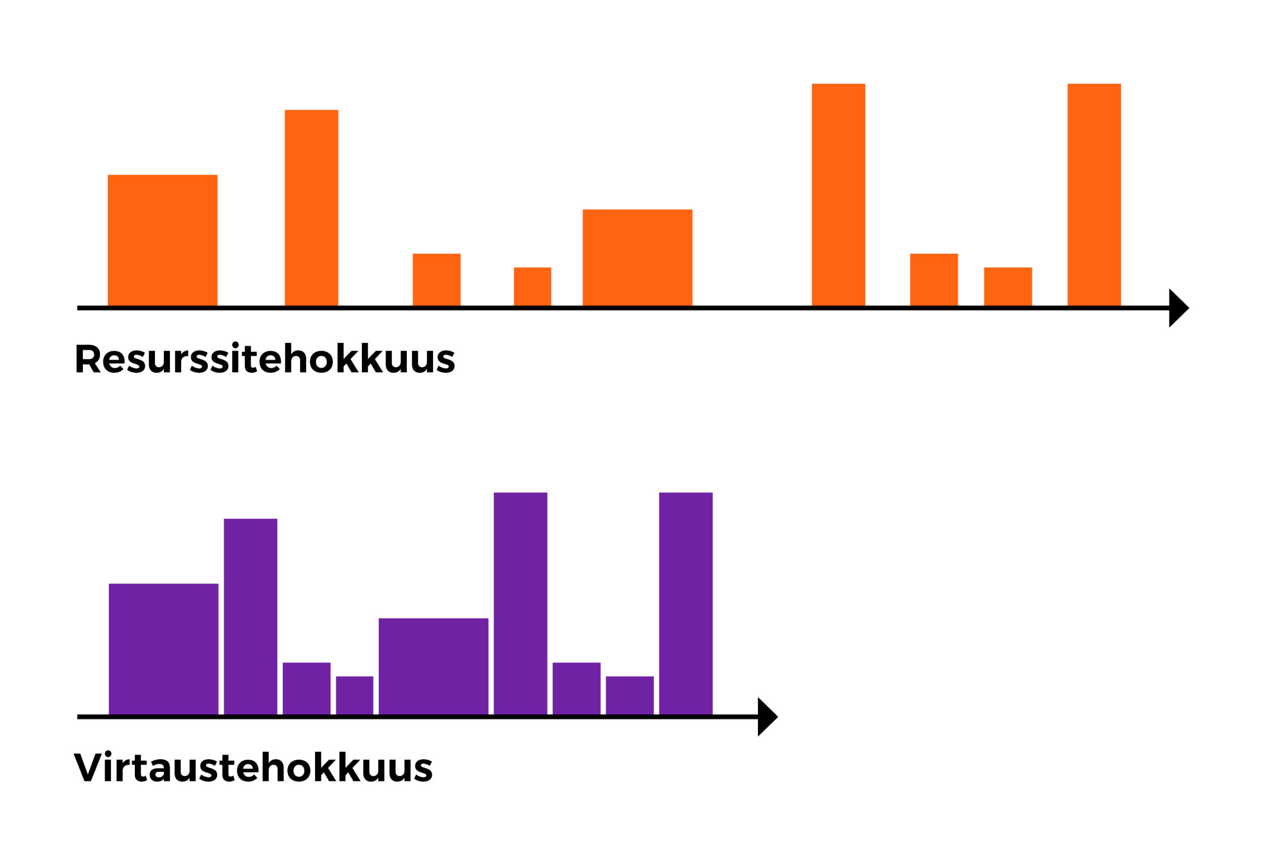 Kuvan aikajanoilla nähdään asiakkaan näkökulmasta erilaisia työvaiheita, jotka seuraavat toisiaan. Resurssitehokkaassa toiminnassa eri työvaiheiden välillä voi olla pitkiäkin aikoja, kun hanke ei etene. Aikaa kuluu odotteluun. Virtaustehokkaassa toiminnassa eri työvaiheet soljuvat yksi toisensa perään, jolloin odotuksesta ei synny hukkaa. Tällä tavoin esimerkiksi linjaremontti valmistuu aiempaa sutjakammin ja asukkaat pääsevät remonttievakosta koteihinsa nopeammin.